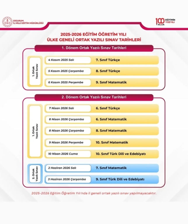 Milli Eğitim Bakanlığı, 2025-2026 eğitim-öğretim yılı kapsamında ülke genelinde yapılacak olan ortak yazılı sınav tarihlerini açıkladı. 6, 7, 8, 9 ve 10. sınıf düzeylerinde uygulanacak sınavlar ile müfredat bütünlüğünü sağlamak ve öğrenci başarılarını sürece dayalı olarak değerlendirmek amaçlanıyor.
