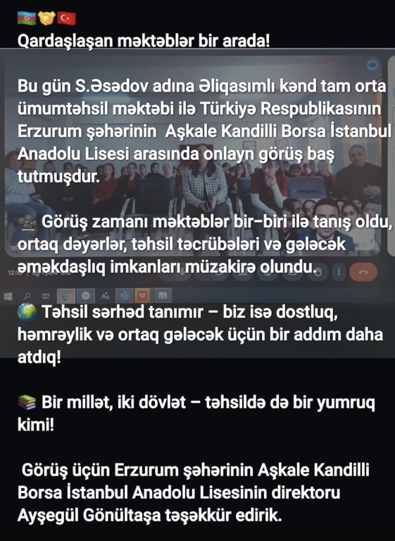 Okulumuzda Azerbaycan’ın Celilabad şehrindeki öğrencilerle telekonferans yoluyla buluşma gerçekleştirildi. Etkinlikte öğrenciler, eğitim hayatlarını, kültürel değerlerini ve günlük yaşamlarını karşılıklı olarak paylaşma fırsatı buldu.